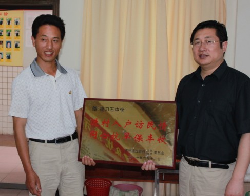 本网讯(通讯员 张铮)6月13日,团林铺镇五岭村党支部书记高荆华、村委会主任陈小兵来到掇刀石中学,将一块写有“进村入户访民情,同心抗旱保丰收”的匾额送到学校党总支书记、校长杨清同志手中。高荆华同志紧紧握住杨清同志的手,深情地说:“感谢掇刀石中学,感谢驻村干部!”