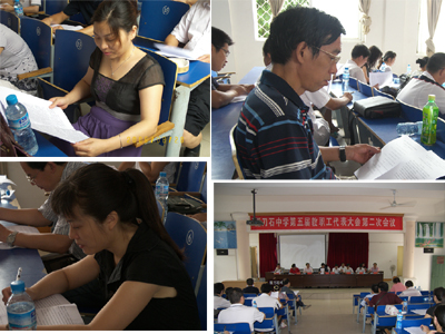 校长杨清在工作报告中回顾了2008—2009学年度学校的发展,他充分地肯定了上学年度中学校以发展为目标,以“创建”为契机,全面提升办学品位的工作成绩。他说创建“省级示范中学”,更新了教师的教育教学观念,培养了学生良好的学习、生活习惯,形成了师生良好的精神风貌,凝聚了人心,增强了斗志,锻炼了我们的干部队伍和教师队伍。与此同时,学校把质量当成生命,以新课改为机遇,不断提高办学水平。09年高考中,我校再创佳绩,文、理科重本科上线130人,本科总计上线788人,超额完成了市教研室给我校下达的目标任务。这一切是与广大教师潜心教学,研究学法,创新教法,竞争协作,团结拼搏分不开的。