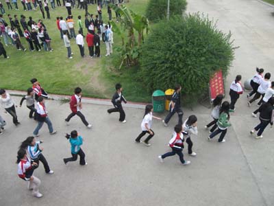 上午9:40,随着警示的哨声响起,全校师生“假戏真做”,一场维护生命的演习慎重地拉开帷幕——正在教室上课的学生在老师的组织下,按照预定的次序,紧急撤出教室,仅仅用时2分钟,全校3000多名师生就紧张有序地从各楼层安全撤离到操场上的安全地带。 整个演练组织有序、行动快速、配合协调,达到了预期目的。