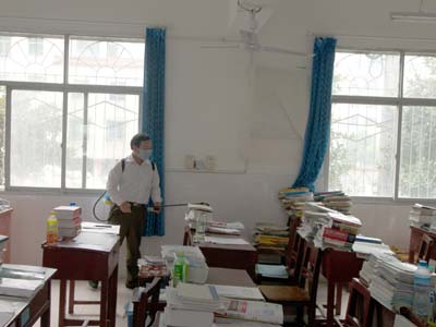 图为防疫人员利用中午学生休息时在教室喷洒消毒药品