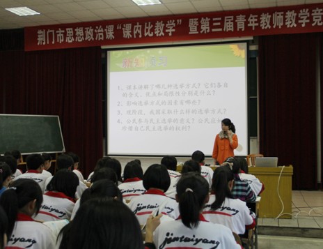 4月11至12日,荆门市“课内比教学”政治学科优质课竞赛在沙洋中学举行,我校周青老师主讲的《民主选举:投出理性一票》一课,得到评委们的一致认可,在十几位选手中脱颖而出,获得一等奖。