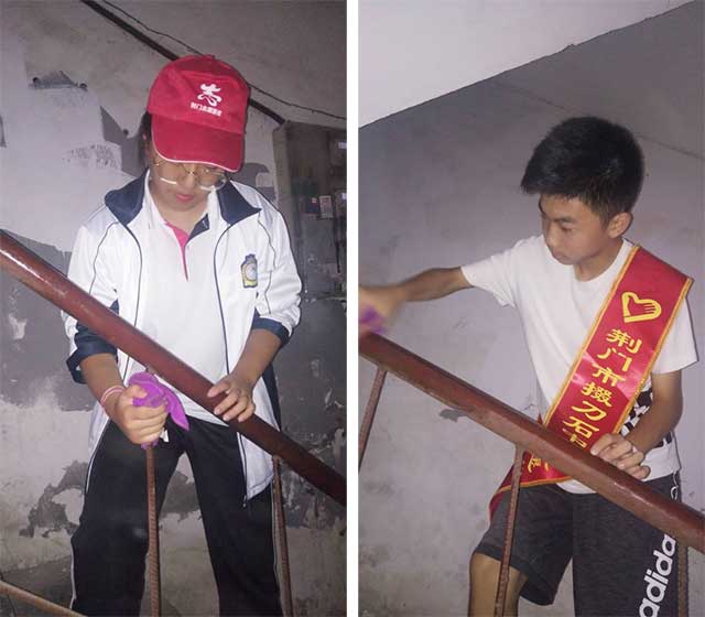 走进社区,擦净公共楼道扶手。