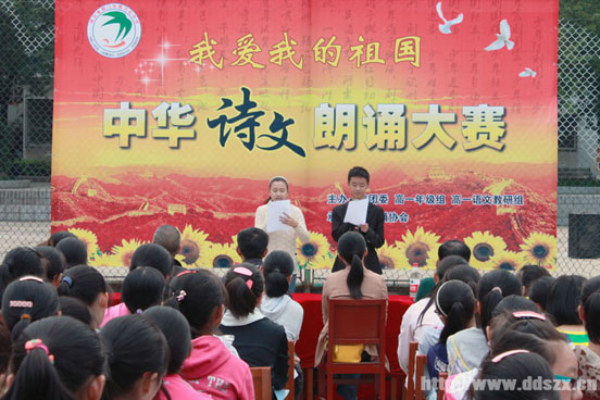 “在无数蓝色的眼睛和褐色的眼睛之中,我有着一双宝石般的黑色眼睛。我骄傲,我是中国人!……”为了庆祝建国64周年, 9月26日,校团委联合高一年级组、高一年级语文备课组在二号篮球场举办了“我爱我的祖国”庆国庆中华诗文朗诵大赛。大赛邀请李强、代翠萍、董云飞、朱运杰、王萍等老师担任评委。选手们精彩的表演博得了同学们的阵阵掌声。经过紧张激烈的角逐,高一(1)班赵潇然,高一(5)班雷晗、张龙,高一(8)班郑雨欣等三组同学荣获一等奖。