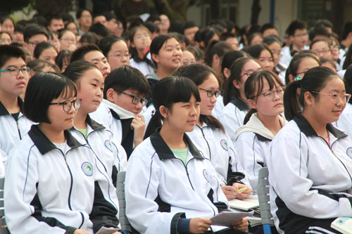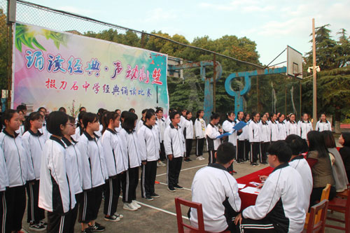 10月24日下午,我校高一年级全体师生齐聚篮球场,参加“诵读经典 声动荆楚”经典诗文朗诵大赛,用诗文向党的十九大、向祖国献礼。黎峰、叶璐、杨艳伟和代翠平四位老师担任了本次大赛评委。