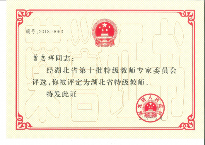 曾志辉同志被评为第十批“湖北省特级教师”