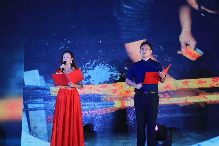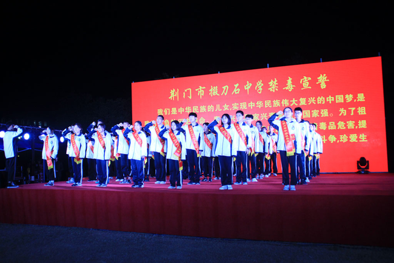 演出中段,近三千师生全体起立,在四十二位身披绶带的优秀学生代表带领下,高举右手,庄严宣誓:拒绝毒品、珍爱生命!动作整齐,声音洪亮,喊出了掇中师生禁毒的决心和勇气。