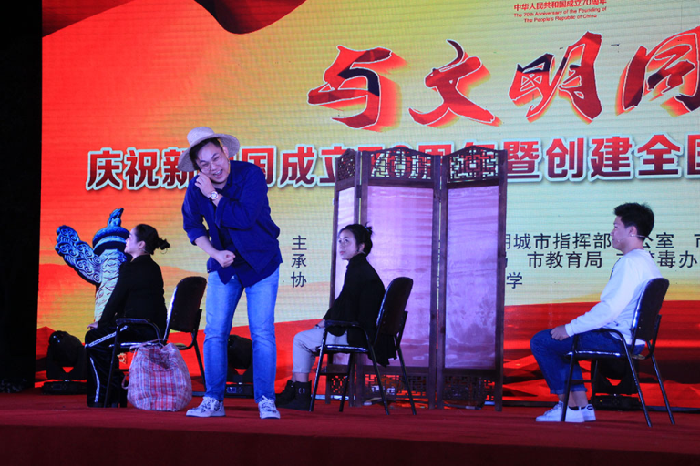 伴随着全校师生对社会主义核心价值观的温习,演出拉开帷幕。歌舞《蒸蒸日上》、诗歌朗诵《创城交响曲》、音乐剧《青春不毒行》、小品《文明旅游》等节目主题明确、异彩纷呈,最后一曲合唱《我和我的祖国》再次歌颂了新中国伟大的七十年。