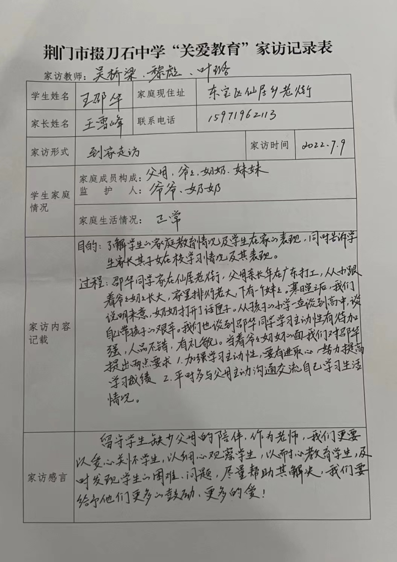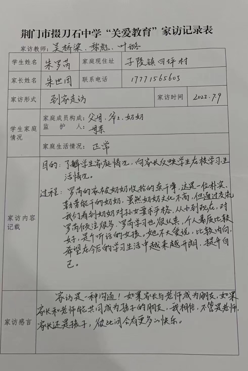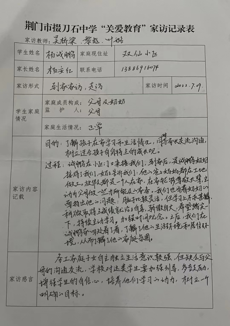 7月9日,暑假第二天,高一(11)班班主任黎彪老师和科任教师副校长吴桥梁、叶璐老师三人,按照《市掇刀石中学党员教师“下基层察民情解民忧暖民心”实践活动之“教师进家庭”工作方案》要求,开始了家访工作。