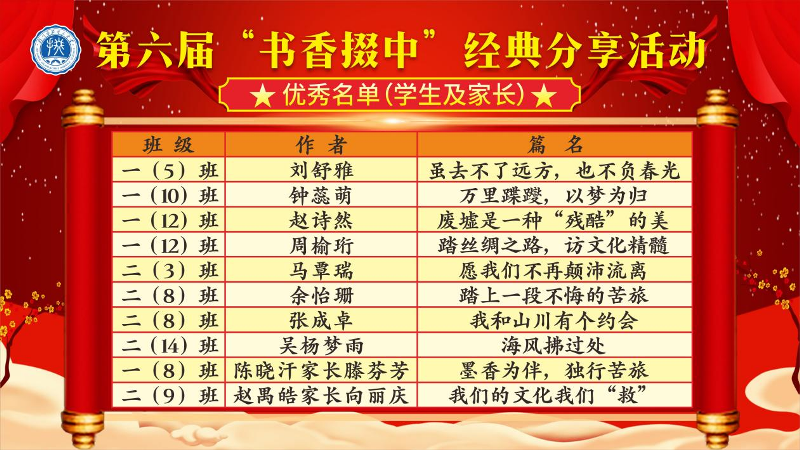 活动期间,学校共收到来自教师138份、学生1211份、家长53份作品。学校组织专业评审小组对作品进行评选。最终方静的《永远在路上》等10篇教师作品,钟蕊萌的《万里蹀躞,以梦为归》、滕芬芳的《墨香为伴,独行苦旅》等10篇学生、家长作品被评为优秀作品。