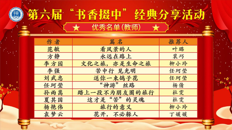 “书香掇中”经典分享活动面向全校师生及家长展开,倡导大家利用暑假从《文化苦旅》《从长安到天山:丝绸之路访唐诗》《风景与记忆》中任选一部,与身边的同学、亲友一起阅读,自由交流,深入探讨,联系以往的旅游经验或阅读中关于旅游的思考,撰写书评,分享对经典的感悟。