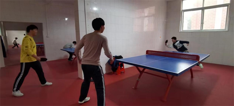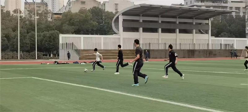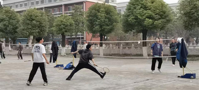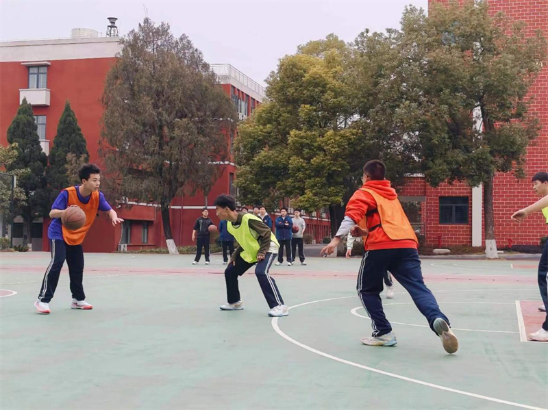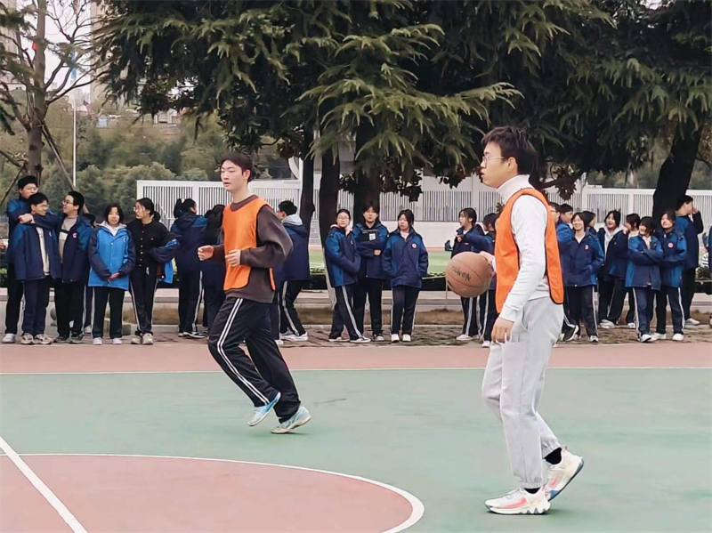 篮球场上,师生同台竞技,你追我赶,抢断助攻,突破上篮,紧咬比分,扣人心弦;足球场上,队员们斗志昂扬,激情十足,带球健步如飞,传球配合无间,射门势不可挡,一任汗水挥洒;羽毛球场上,随着小球的跳跃旋转,同学们或大力扣杀,或轻盈挑球,或沉稳回击,打得有来有往;乒乓球馆里,学生个个全神贯注,手上搓拉攻推,挥拍娴熟,脚下进退旋扭,步履矫健,不甘示弱……每一处球场边,都有热情的啦啦队鼓掌加油,呐喊助威,场上场下热闹非凡。