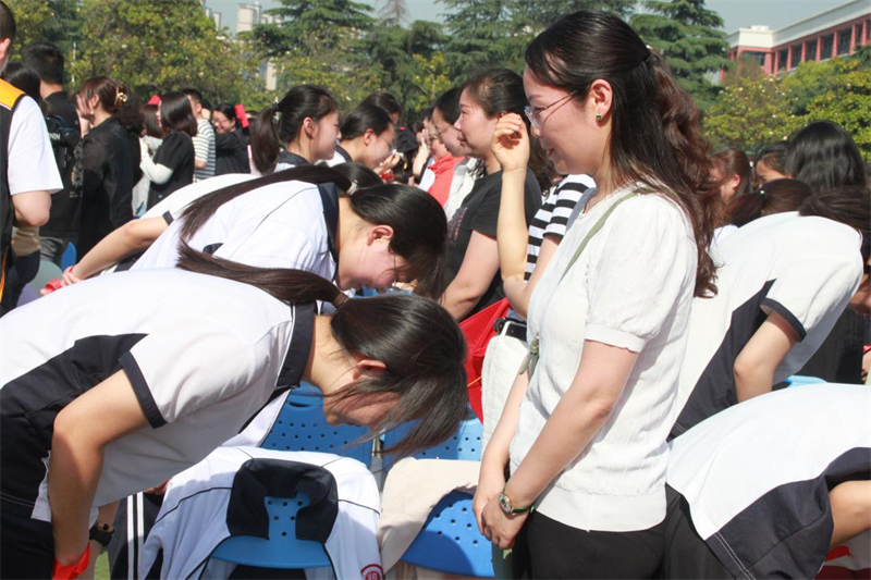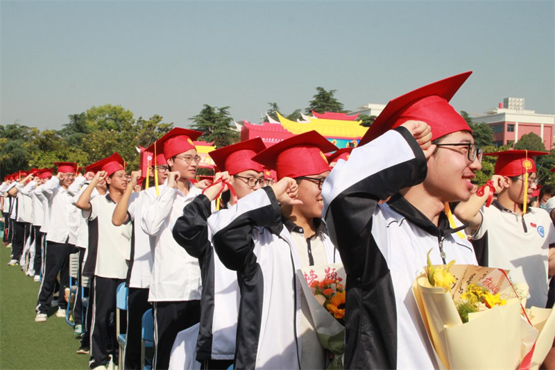 “虽然失败的苦痛,已让我遍体鳞伤,可我坚信光明就在远方……”在激情澎湃的《光明》余韵中,领导、老师、家长们共同为学子们加冠帽、正流苏,同学们则激动地行礼拜谢。手握《中华人民共和国宪法》,他们郑重宣誓: