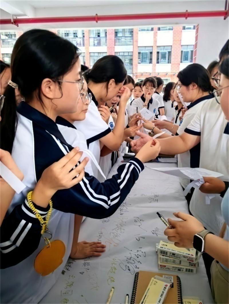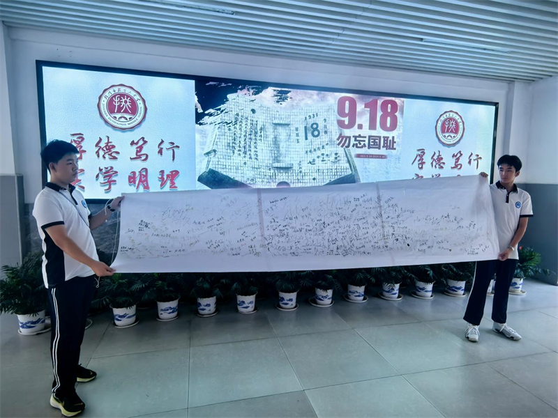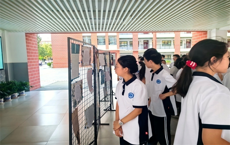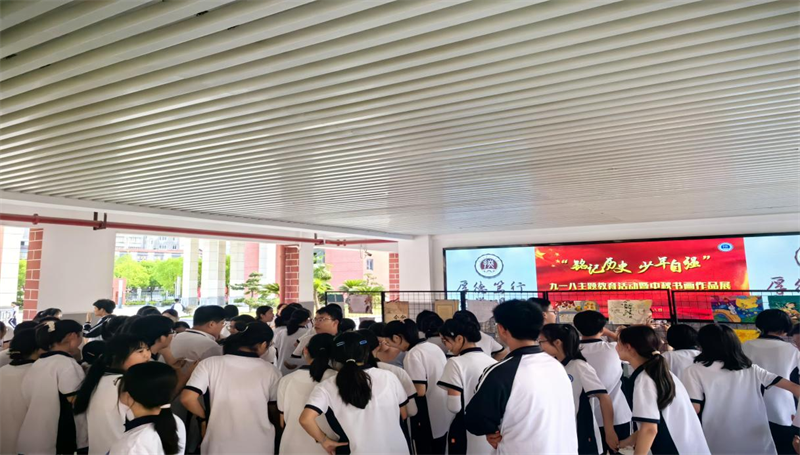 在作品展的互动环节中,师生们积极参与,他们或驻足欣赏,或低声讨论,或在纪念板上签下自己的姓名。高一(11)班的杨如霜同学在参与活动后感慨地说:“历史是最好的教科书,九一八事变是我们民族记忆中不可磨灭的伤痛,这提醒我们当今的幸福生活来之不易。作为青年,我们要把握当下,树立理想,努力学习,方能不负历史、不负韶华。”