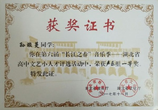 )公布了2017湖北省“长江之春”音乐季——高中文艺小人才评选活动的结果,我校高二(12)班孙嘏蔓同学荣获声乐组一等奖。