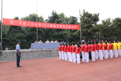 本网讯(通讯员 徐丽琴)9月8日下午,2010级新生军训总结大会在学校操场举行。1000多名新生在主席台前进行了精彩的会操。校长杨清、教学副校长赵正林、政教副校长李锡平、高一年级主任鲁勇、高一年级政教主任范江华和同学们一起分享了6天军训的成果与喜悦。总结大会上,汇报表演的同学们意气风发,动作整齐规范,展示了2010级新生激流急先的风采。
