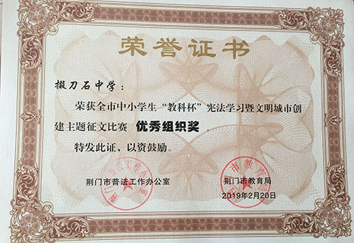 市中小学“教科杯”宪法学习暨文明城市创建主题征文比赛优秀组织奖