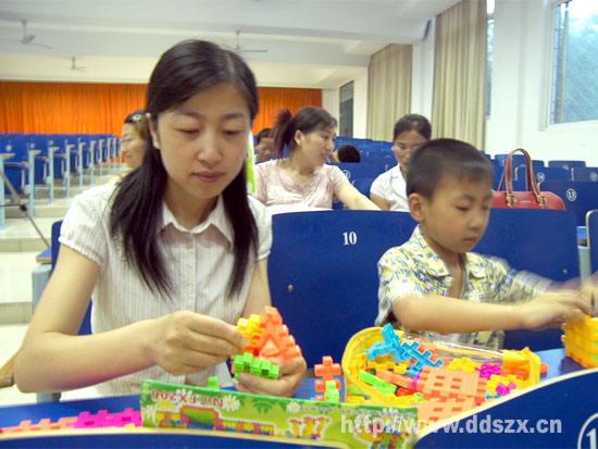 晚会开始前,郑浩然在和妈妈代淑英兴致勃勃的玩积木,这是他刚刚收到的我校工会送给他的节日礼物。