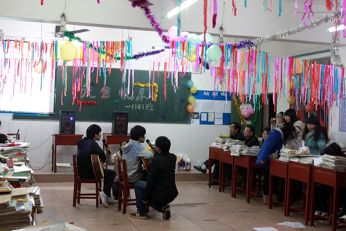 2011年12月29日晚七时,按我校传统,全校师生分班级举行元旦文艺晚会,同学们自己动手将教室布置的色彩斑斓,同学们和老师欢聚一堂,到处是欢歌笑语,校园的各个角落都充满了浓烈的节日的气氛!