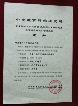 近日,我校申报的中央教科所专项课题《生态体验:感动师生生命的魅力德育模式研究》的子课题《“三自”德育管理模式的探索》已被中央教科所批准。这意味着我校的德育科研工作面临新的创新和挑战。“三自”德育是学生自主学习、自主管理和自主调适。这种德育模式探究的是如何让学生全面发展、健康发展。它包括:自主探究、合作、交流、实践的自主学习;生活更充实,学习更轻松,兴趣更广泛,纪律更严明的自主管理;心理更成熟、身体更健康、性情更平和、交流更顺畅的自主调适。