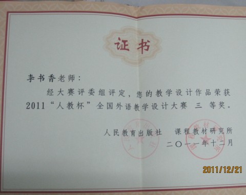 2011年12月15日,我校高三英语教师李书香参加了2011“人教杯”全国外语教学设计大赛,并荣获三等奖。她的教学设计——人教新课标必修3第三单元第三课时语法课,受到了专家好评。在活动过程中,李书香老师还和全国各地的英语教学工作者充分交流,参加了由教材主编刘道义教授及首都师范大学博导主讲的专家讲座,收获颇丰。此次大赛由人民教育出版社、课程教材研究所主办,共收到教学设计5788份,获奖作品600份,其中湖北省高中组有7名教师获奖。