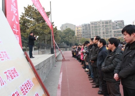 “我们将精诚团结,通力合作;刻苦钻研,精心备课;甘于奉献,燃烧激情;关注考情,全力以赴;严谨治学,一丝不苟;尽心尽力,不留缺憾……”2月28日下午,我校运动场上传出响亮的口号声。三月调考在即,高考已是足声可闻,高三年级千余名师生正在举行2012届决战高考百日冲刺庄严宣誓。教科处副主任、高三年级主任陈万主持誓师大会。