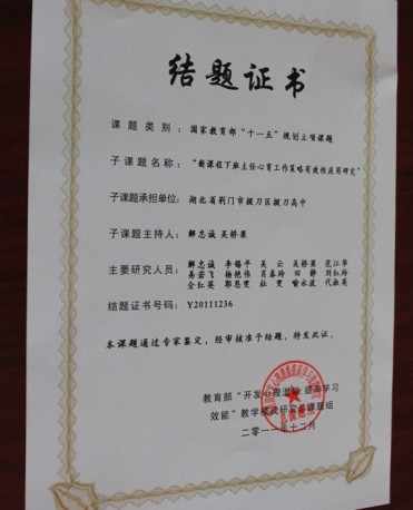 近日,历时4年的课题研究——全国教育教学“十一五”规划教育部课题实验子课题《新课程下班主任心育工作策略有效性的应用研究》结题。在课题组全体成员认真努力地工作下,本课题组提交了论文集、个案辅导等研究成果,得到了课题组的肯定。这个课题的研究与实践,提高了我校学生的心理健康水平,促进了学生的潜能开发,改变了教师的教育教学观念,尤其提升了班主任的心育意识,为构建和谐校园做出了可喜的贡献。