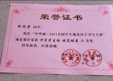 近日,“中华诵·2011全国学生规范汉字书写大赛”湖北赛区竞赛结果揭晓,掇刀石中学高三(4)班胡雨荣同学和高二(9)班李梦娇同学分别荣获“中学学生组硬笔楷书”二、三等奖。获奖证书由湖北语言文字工作委员会和湖北省教育厅联合颁发。