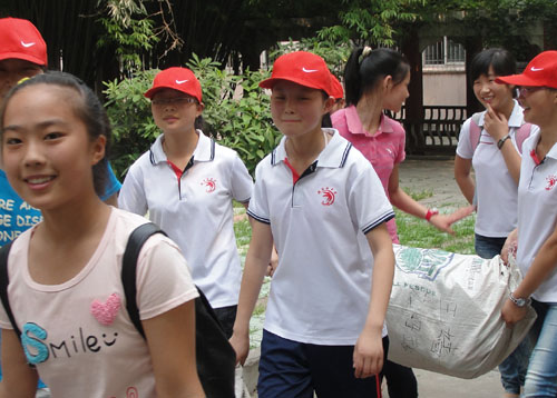 在我校考点,为中考服务的青年志愿者是一道亮丽的风景线,师生亲切地称他们为“小红帽”。6月19日下午3:30,在学生公寓门前, “小红帽”对入住我校的团林中学、麻城中学考生进行热烈欢迎,提供温馨服务,给考生带路、拿行李,忙得不亦乐乎;下午4:00,考生到校看考场,“小红帽”热情带路,与考生亲切交谈,传授应考经验;下午4:50,志愿者们又对校园的环境卫生再次进行清理,为考生营造舒心的备考环境;下午5:10,“小红帽”来到学校食堂,帮忙洗菜,摆餐具,端菜,准备考生晚餐;下午6:00,考生就餐,“小红帽 ”帮忙添菜,盛汤,舀米茶;晚上7:00,“小红帽”收拾餐桌,整理餐具……这就是“小红帽”半天的工作,紧张、辛苦而又充实。