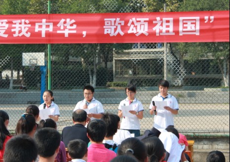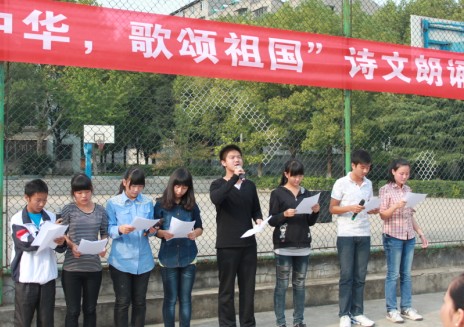 时光飞逝,岁月如梭,在这硕果累累的金秋十月,我们迎来了中华人民共和国的63岁生日。为了迎中秋、庆国庆,校团委举办了系列庆祝活动。庆祝活动有“爱我中华、传承文明”主题书法大赛、“爱我中华、勿忘国耻”主题黑板报比赛等。9月29日校团委和高一年级组联合举办的“爱我中华,歌颂祖国”中华经典诗文朗诵大赛把本次庆祝活动推向高潮。朗诵比赛有高一年级14个班参加,每班各推荐一个节目参赛。校团委书记柳小玲、校团委副书记王春梅和高一年级部分语文老师担任评委。高一年级团总支书记卢紫荆担任主持人。高一年级有近千名学生欣赏了这些优秀选手的精彩表演。参赛者将诗词配上音乐,或款款深情,或激情高昂,或满腔悲愤,把诗词的精神全方位展示出来,伴随琅琅诵读声,观众们的掌声也是此起彼伏,不绝于耳。朗诵赛让同学们真切地领略到诗歌之意境,深刻地体会到中华诗词之经典,激发了同学们的浓浓爱国情怀。经过认真评比大赛最终评出一等奖2名、二等奖3名、三等奖5名。此次朗诵赛使 “迎中秋、庆国庆”系列庆祝活动圆满地落下帷幕。