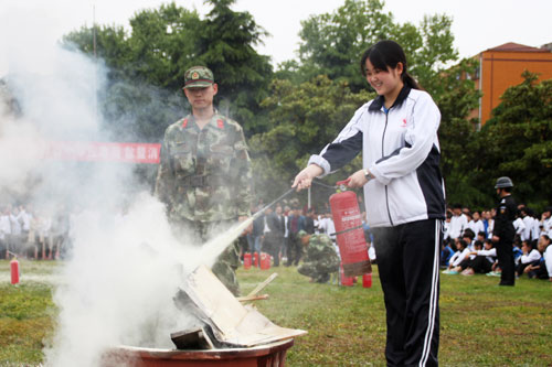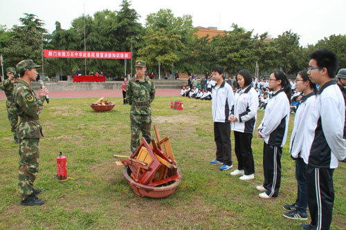 随后,掇刀区消防中队官兵为高一、高二师生及后勤管理人员介绍了常见灭火器的使用方法并做了现场示范。学校随即组织后勤服务人员和部分学生亲自参与实地灭火演练。消防官兵们还为师生讲解了遭遇火灾之后的常见逃生方法。演练结束后,安保处主任范江华对本次演练活动进行了总结,提出改进措施,进一步强调逃生中应注意的问题,切切实实地提高了学生的消防安全意识和抗御火灾的能力。