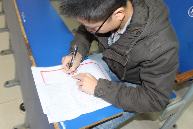 比赛现场同学们专注认真地书写每一个字,虽有正楷与行草书法之分,但同学们高昂的热情丝毫不减。有几个同学的硬笔书法写得行云流水,而有几个同学的毛笔书法是苍劲有力。最后,每个参赛者都上交了自己满意的作品。此次比赛共评出了一等奖两名、二等奖三名、三等奖五名。