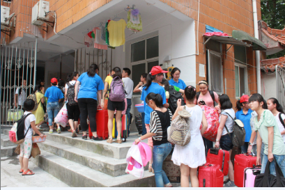 本次志愿服务的第一件事,就是帮助在我校住宿的团林、麻城两所中学初三的400多名考生入住学生公寓。志愿者戴着红色的志愿者帽子,穿着统一发放的蓝色T恤衬衫,等候在公寓门口,帮助各位考生搬运生活用品到宿舍。从1楼到5楼,搬上去,跑下来,再搬上去,再跑下来。志愿者们始终秉承着“哪里需要帮助,哪里就有志愿者”的服务宗旨,就这样反反复复,在楼梯间穿梭着。