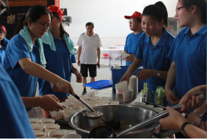 本次志愿服务的重头戏,是协助食堂师傅为考生们准备考试期间的一日三餐。每天早上620,志愿者们就早早地来到学校,为考生们准备早餐,铺桌布,盛稀饭,摆馒头、花卷、鸡蛋、汤勺、碗筷等。1120名考生,140桌,粗略估计,每位志愿者每天早上要在食堂来回近五、六十趟。每餐饭前,志愿者们都要提前一个小时来准备,保证每位考生一到食堂就能吃到可口的饭菜。他们的热情深深地感动着每一位考生和带队教师,也获得了参考师生们的一致好评。他们说:掇中想得真周到。由于工作做得到位,全部考生进餐时间只需要短短的10分钟,大大节省了考生的吃饭时间。