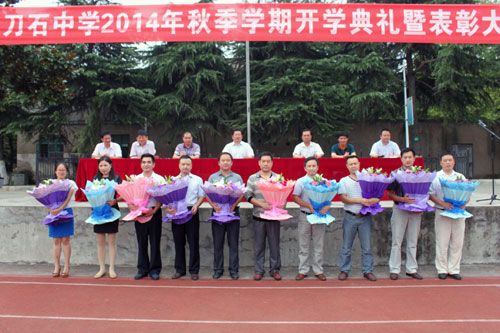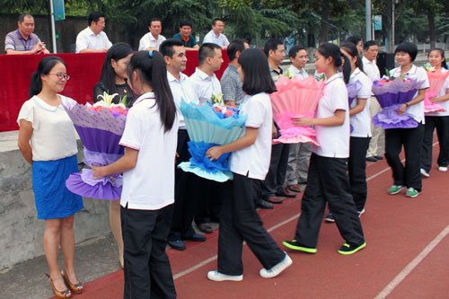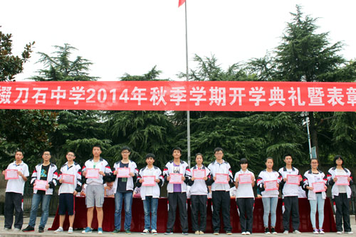 开学典礼上,副校长解忠诚代表学校宣读了表彰文件。学校对优秀学生干部、三好学生、积极分子、优秀团干、优秀团员进行了表彰。学校还表彰了10名高三年级优秀教师代表,学生向优秀教师代表献花送祝福。校领导向受表彰的师生颁奖,并希望他们再接再厉,再创佳绩。高一(2)班杨小凡同学代表新生发言,他说这一届高一新生一定会以高考骄子为榜样,高扬梦想之帆,实现自己美好愿望。高三(2)班王盈同学代表全体高三学子表了奋战高考、力创辉煌的决心。