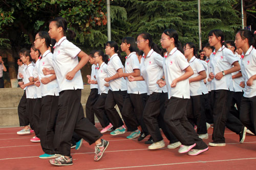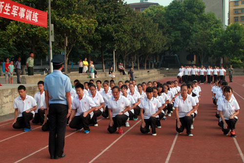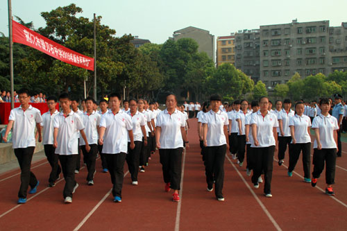 运动场上,经过5天军训的新生精神饱满,列队整齐,等待检阅。在激昂的检阅进行曲中,杨清校长在某国防教育培训中心张教官的陪同下对全体受训新生进行检阅。一时间,“同学们好”、“校长好”、“同学们辛苦了”、“为校争光”的声音响彻整个运动场上空。紧接着,各班方阵激情满怀、步伐整齐,依次来到主席台前,进行了分列式汇报表演。其中,由各班挑选组成的女子方队分别进行了军体拳和队列动作汇报表演,赢得了大家热烈的掌声。