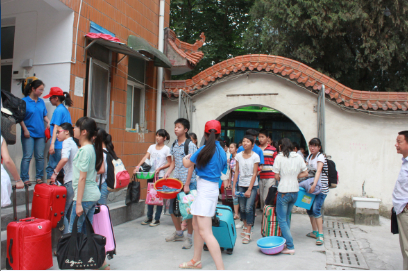本次志愿服务的第一件事,就是帮助在我校住宿的团林、麻城两所中学初三的400多名考生入住学生公寓。志愿者戴着红色的志愿者帽子,穿着统一发放的蓝色T恤衬衫,等候在公寓门口,帮助各位考生搬运生活用品到宿舍。从1楼到5楼,搬上去,跑下来,再搬上去,再跑下来。志愿者们始终秉承着“哪里需要帮助,哪里就有志愿者”的服务宗旨,就这样反反复复,在楼梯间穿梭着。