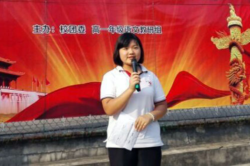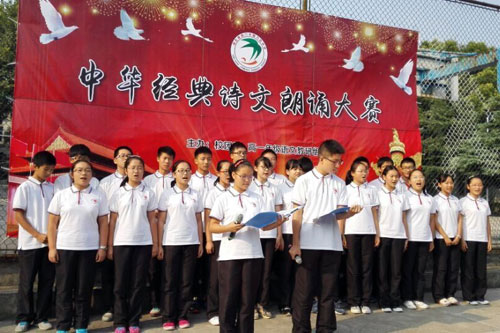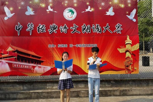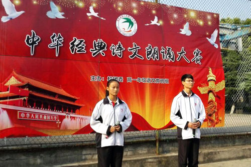“我和我的祖国一刻也不能分割,无论我走到哪里都流出一首赞歌。我歌唱每一座高山,我歌唱每一条河,我亲爱的祖国,我永远紧依着你的心窝…...”9月29日下午校团委联合高一年级语文备课组,举办了迎国庆中华诗文朗诵大赛,共庆我们伟大的祖国66周年华诞,祝福祖国繁荣昌盛。本次比赛特别邀请到高二、高三年级语文备课组李强、康艳丽等五位老师担任评委,邀请到掇刀石中学语文教研组组长黎峰老师担任点评嘉宾。