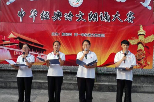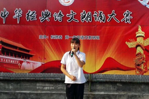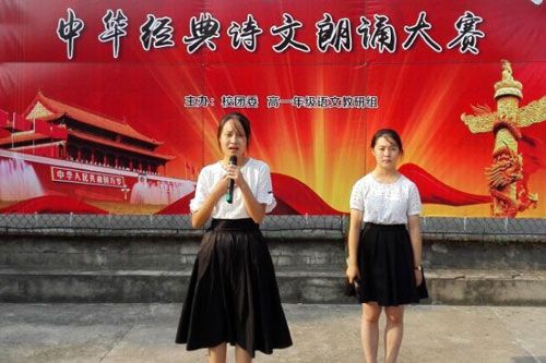 “走向远方是为了让生命更辉煌,走在崎岖不平的路上,年轻的眼眸里装着梦更装着思想。”高一(11)班的韩柳、叶伟东同学朗诵的诗歌《走向远方》,激励着青年奋发有为,不甘平庸。只有进行了激情奋斗的青春,只有进行了顽强拼搏的青春,只有为国家、为人民作出了奉献的青春,才会留下充实、温暖、持久、无悔的青春回忆。他们深情并茂的朗诵打动了在场师生,一举夺魁。高一(4)班的郑俊娣、陈沐等同学朗诵的《祝福您祖国》,颂出了对祖国崛起之路的无限喜悦,颂出了对祖国母亲无限的热爱和祝福!高一(2)班31位同学参加朗诵,体现出全班同学高度团结和默契,也表达出了同学们对祖国深深的热爱!
