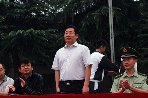 在动员大会上,担任本次军训任务的解放军武警部队的官兵们为同学们展示了军人风采。他们挺拔的军姿,整齐划一的示范动作,博得了新生们阵阵掌声。校长杨清在动员大会上发表讲话.他首先代表学校党总支、校委会对新同学的到来表示了热烈的欢迎,对支持我校军训工作的全体教官表示敬意。他说,军训是高中生活的起点,将在同学们人生路上留下深深的印记,对塑造同学们健全的人格和良好的意志品质起到十分重要的作用。知识改变命运,习惯决定未来!好习惯比高智商更重要,好习惯使人受益终生。同学们要充分认识军训的重要意义,高标准,严要求,发扬不怕吃苦顽强拼搏的精神,尊敬教官,报从命令,善始善终地完成军训任务。