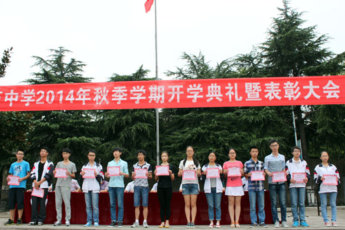 开学典礼上,副校长解忠诚代表学校宣读了表彰文件。学校对优秀学生干部、三好学生、积极分子、优秀团干、优秀团员进行了表彰。学校还表彰了10名高三年级优秀教师代表,学生向优秀教师代表献花送祝福。校领导向受表彰的师生颁奖,并希望他们再接再厉,再创佳绩。高一(2)班杨小凡同学代表新生发言,他说这一届高一新生一定会以高考骄子为榜样,高扬梦想之帆,实现自己美好愿望。高三(2)班王盈同学代表全体高三学子表了奋战高考、力创辉煌的决心。