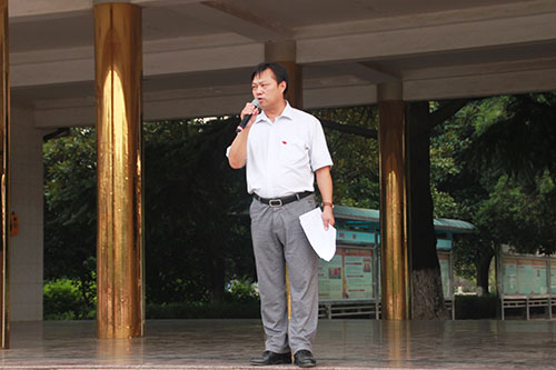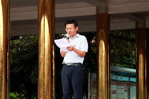 副校长李锡平在飘扬的五星红旗下号召全校师生,做一个讲文明、懂礼仪的人,为创建卫生城市贡献自己的力量。他呼吁大家从身边的小事做起,如食品不要上教学楼,不要随地丢垃圾等等。