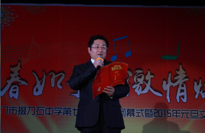 校长杨清中英双语发表新年致辞。他说,天心随律转,人事逐年新,道别2014年,我们曾认真书写学校的每一天,我们用智慧和汗水展示着师生的敬业形象,用真诚和关怀构筑着学生的和谐发展之路。回首过去,豪情满怀;展望未来,信心百倍。他希望老师们和同学们在新的一年里,将希望孕育,与理想握手,和未来签约,用开拓创新精神,真抓实干,共创掇刀石中学美好的明天!