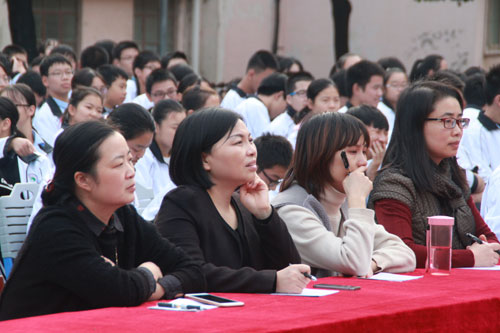 10月24日下午,我校高一年级全体师生齐聚篮球场,参加“诵读经典 声动荆楚”经典诗文朗诵大赛,用诗文向党的十九大、向祖国献礼。黎峰、叶璐、杨艳伟和代翠平四位老师担任了本次大赛评委。