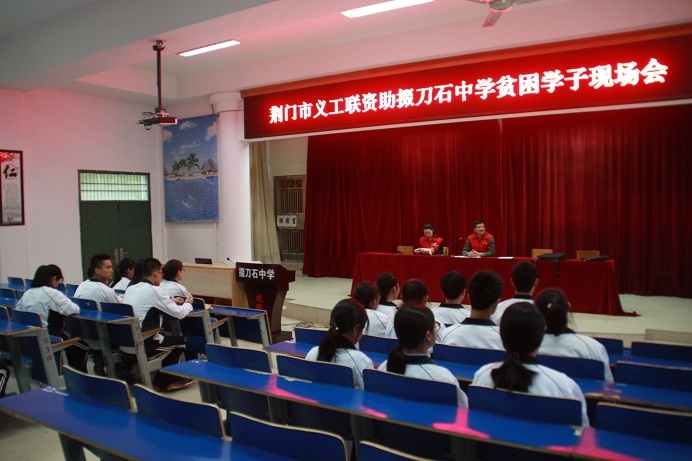 4月12日下午,荆门市义工联合会助学工委成员在丁哨兵理事的带领下来到我校,了解我校部分家庭经济困难学生的学习和生活情况,并向他们提供来源于社会的捐助。