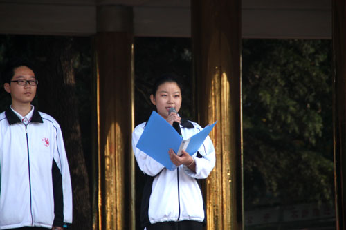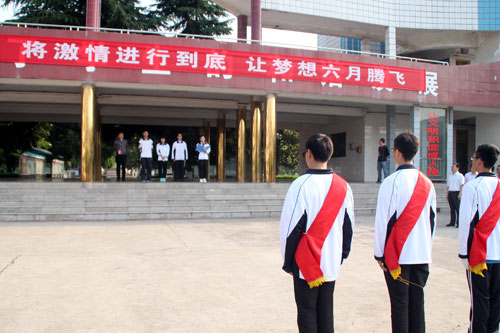 高一(14)班的李省安同学、高一(1)班的杨杰同学、高二(1)班的赵洁同学分别代表学生会和高一、高二年级的同学们,为高三学子们送上了精心准备的祝福:“为青春喝彩!为高考加油!”“蚕蛹破茧,蝶舞在天!”“凤凰展翅,王者归来!”……一次次呐喊,一声声祝福,传递着高一、高二年级学生的真诚与友爱,也赢得了高三学子的阵阵掌声和回应。高三(1)班的张栌轩同学代表高三学子在国旗下做出郑重承诺——为掇中创辉煌,为学弟学妹做榜样!爱的互动让掇中成为一座人文涌动、温馨动人的乐园。