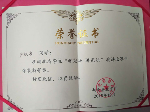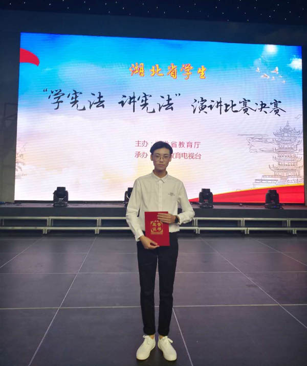 19日上午的决赛精彩纷呈,掌声不断。严钦泉顶住压力,全力以赴,以93.33的佳绩,与襄阳市学生代表并列第一,获省特等奖。他们将争夺全省唯一一张全国第三届“学宪法讲宪法”演讲比赛的高中组