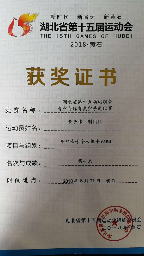 五环之光耀荆楚,八方健儿竞风流。8月2 1日,湖北省第十五届运动会在湖北黄石举行。我校高三(12)班黄子炜在青少年体育类空手道比赛中不畏强手、奋力拼搏,荣获甲组女子个人组手61KG第一名。