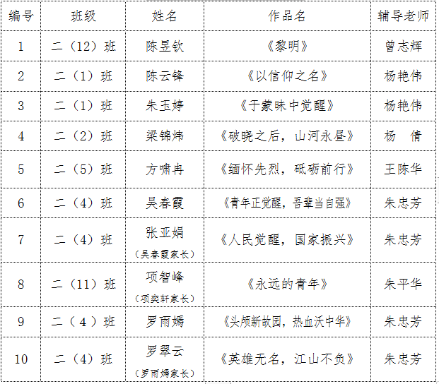 学校共收到来自教师120份、学生1256份、家长55份作品,专业评审小组对作品进行审核评比,最终评选出以范敏老师的《毛泽东的老师们》为代表的10篇优秀教师作品、以梁锦炜的《破晓之后,山河永昼》为代表的7篇优秀学生作品和以项智峰的《永远的青年》为代表的3篇家长作品。