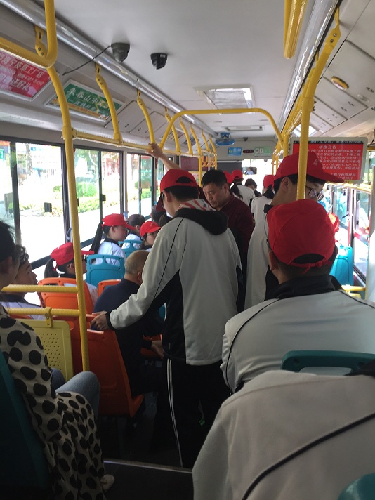 在公交车上,掇中志愿者发扬雷锋精神,文明礼貌,敬老爱幼,给需要帮助的老人、儿童、孕妇让座。